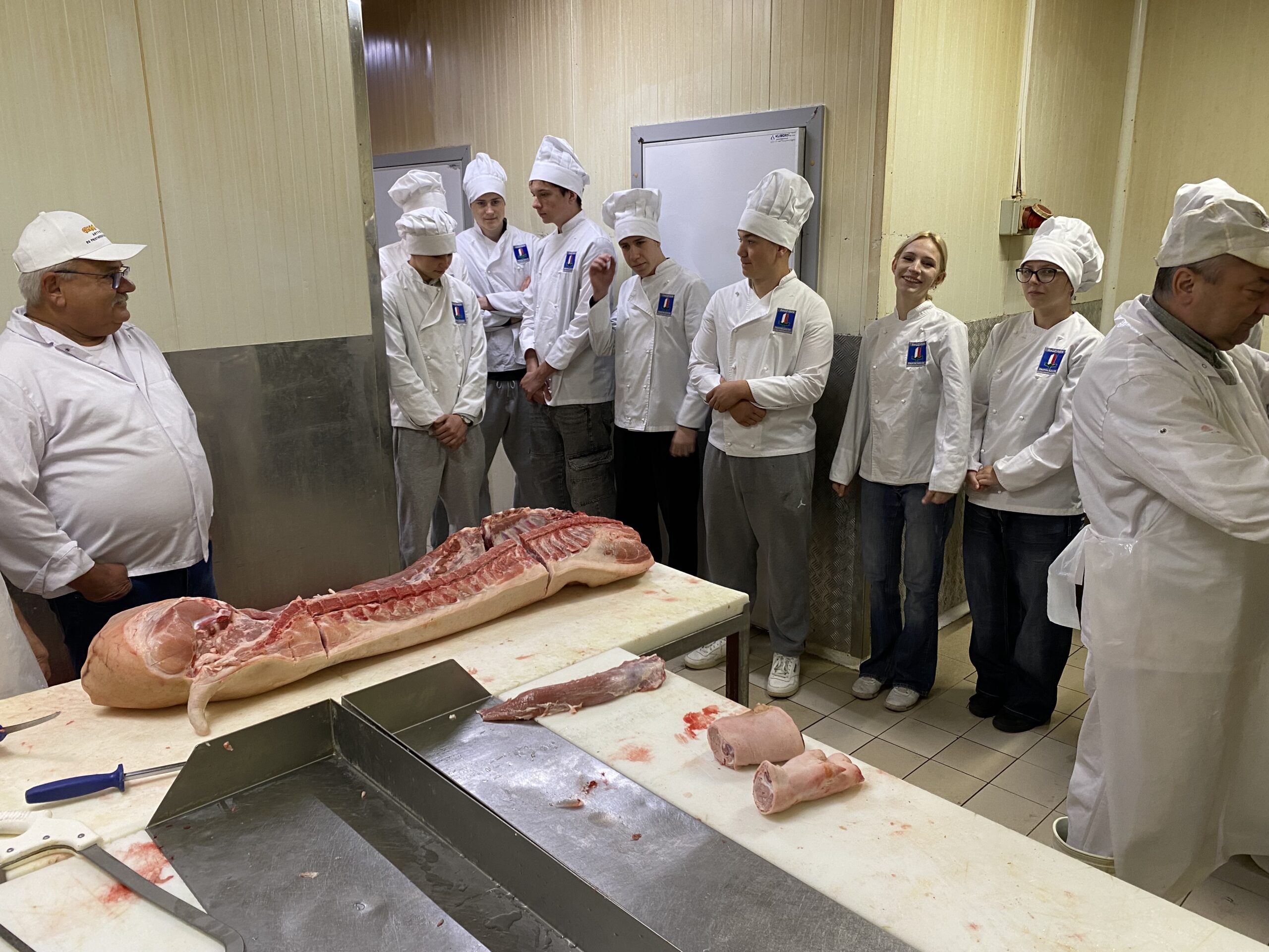 Dnia 30.09.25r. uczniowie klasy IIE  TŻiUG uczestniczyli w warsztatach zawodowych zorganizowanych w sklepie Intermarché w Radzyminie, z którymi szkoła współpracuje już od kilku lat. Tematem zajęć był rozbiór półtuszy wieprzowej. Podczas warsztatów uczniowie mieli okazję zapoznać się z zasadami prawidłowego rozbioru mięsa wieprzowego, rozpoznawaniem poszczególnych elementów tuszy oraz zasadami bezpieczeństwa i higieny pracy w chłodni.