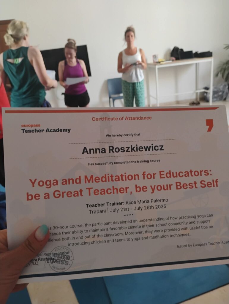 W ramach programu unijnego Erasmus+ pani Anna Roszkiewicz, nauczycielka wychowania fizycznego, uczestniczyła w tygodniowym kursie: Yoga and Meditation for Educators, który odbył się w lipcu 2025 roku, w Trapani, we Włoszech